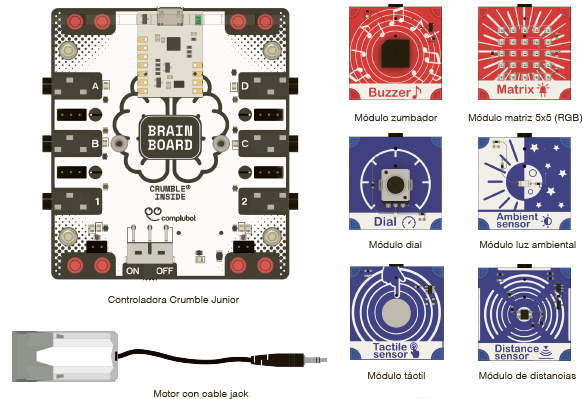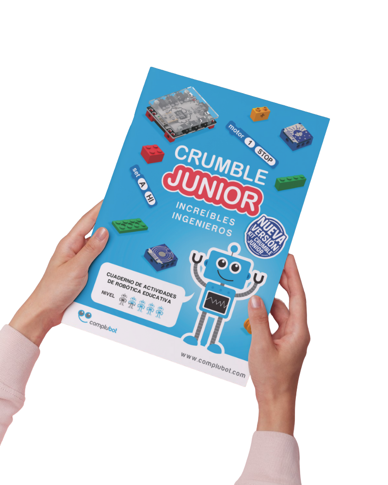 Para facilitar el trabajo en el aula, el kit Crumble Junior incluye una guía impresa con instrucciones detalladas para montar paso a paso cada uno de los 10 proyectos.